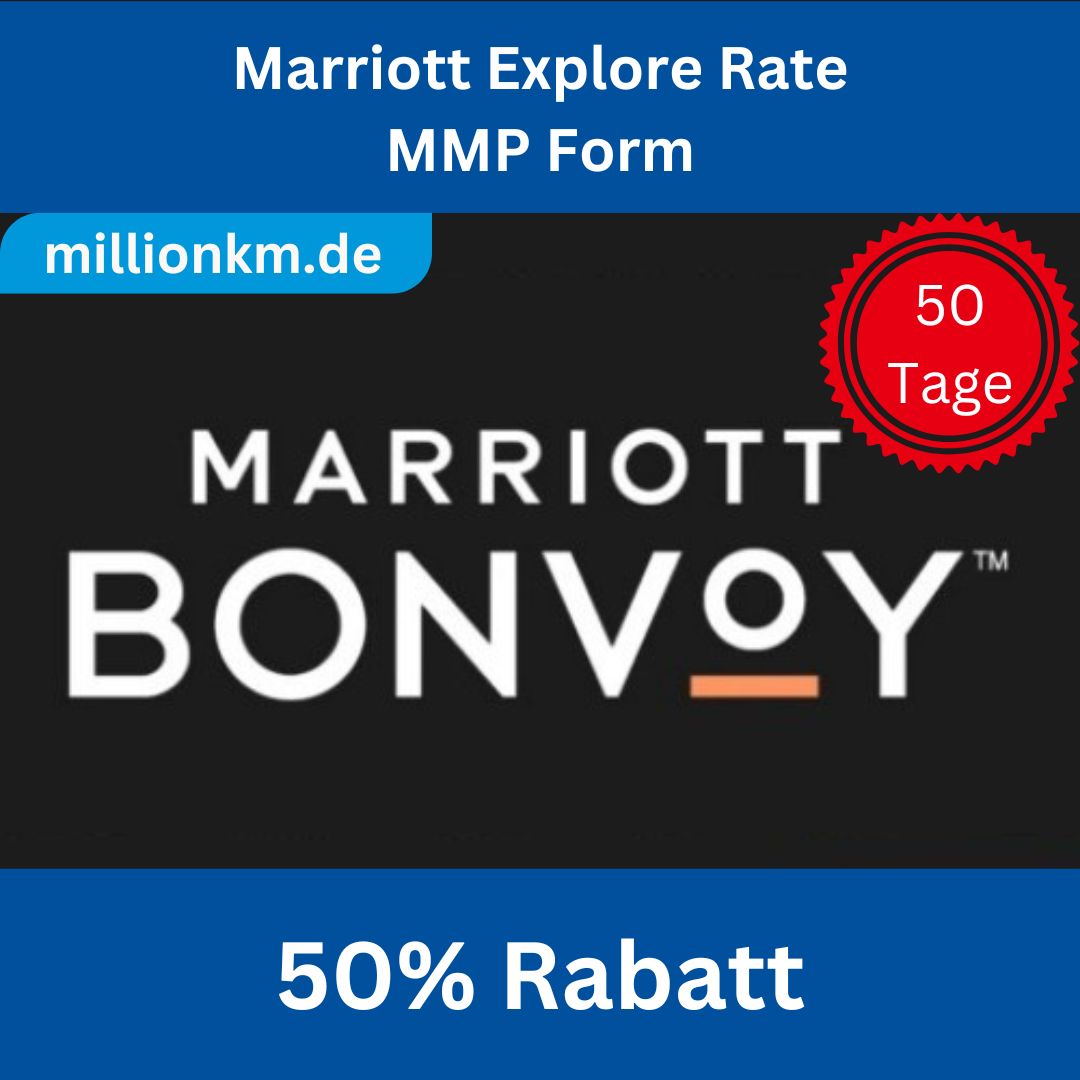 Die Marriott Explore Rate bietet den höchsten Rabatt (50-60%) im Marriott Treueprogramm. Buchung erfolgt mit MMP Code. Zeigen Sie Ausweis und MMP Form beim Check-in vor.